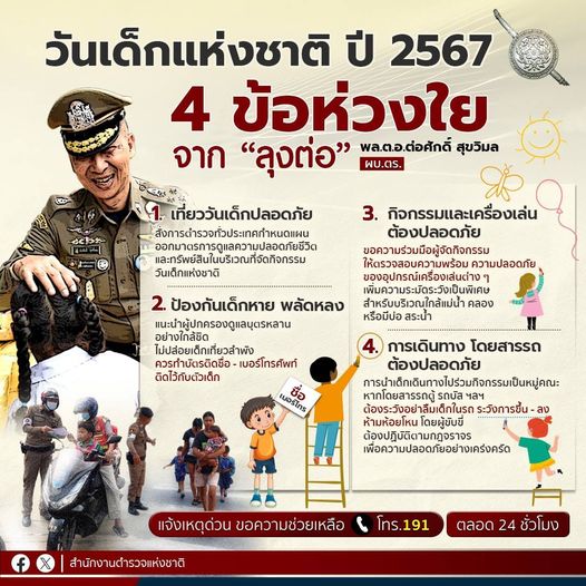 วันเด็กแห่งชาติ ปี 2567 4 ข้อห่วงใย จาก”ลุงต่อ” พล.ต.อ.ต่อศักดิ์ สุขวิมล ผบ.ตร. 12 มกราคม 2566 โดย admin